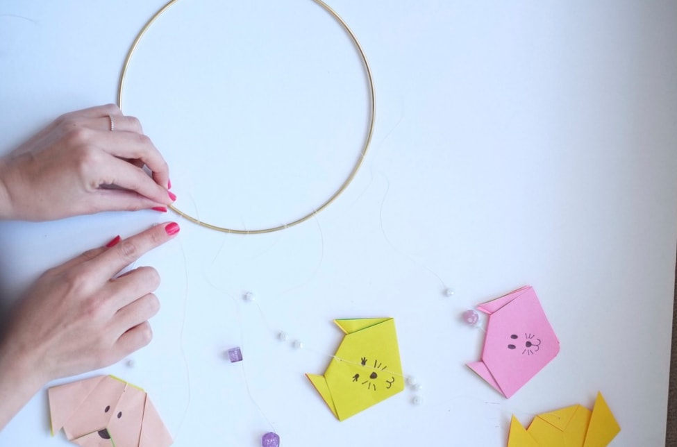 По такому же принципу делаем еще несколько заготовок в виде животных. После этого поочередно прикрепляем их к обручу небольшого размера.