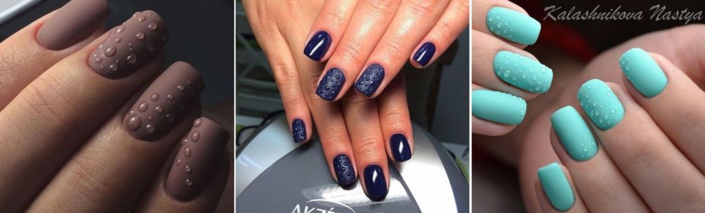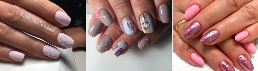 | однотонный | Даже в однотонном маникюре капли дождя смотрятся очень эффектно. Небольшие вкрапления придадут особой глубины. Лучше всего глянцевые капли дождя смотрятся на матовом покрытии, так как происходит игра текстур. |