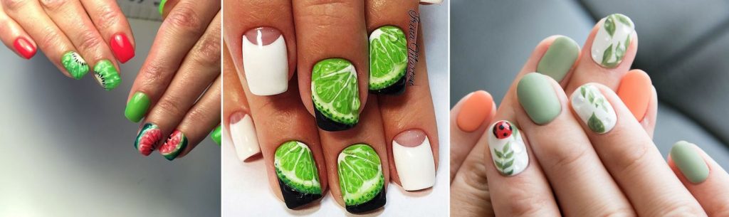| фруктовый | Фруктовый дизайн ногтей будет смотреться аппетитнее, если на тропических плодах появится несколько капелек воды. |