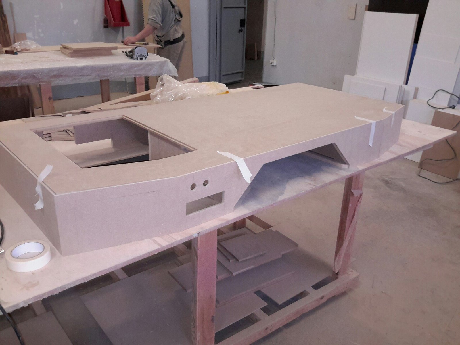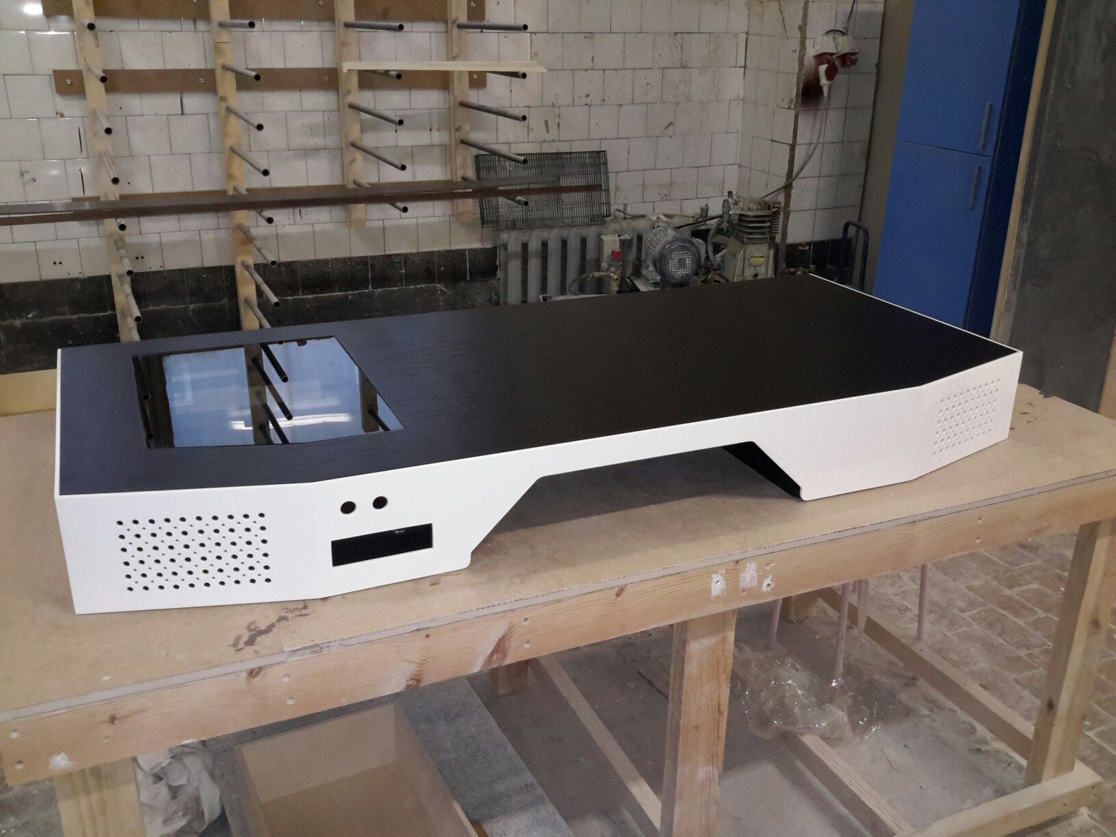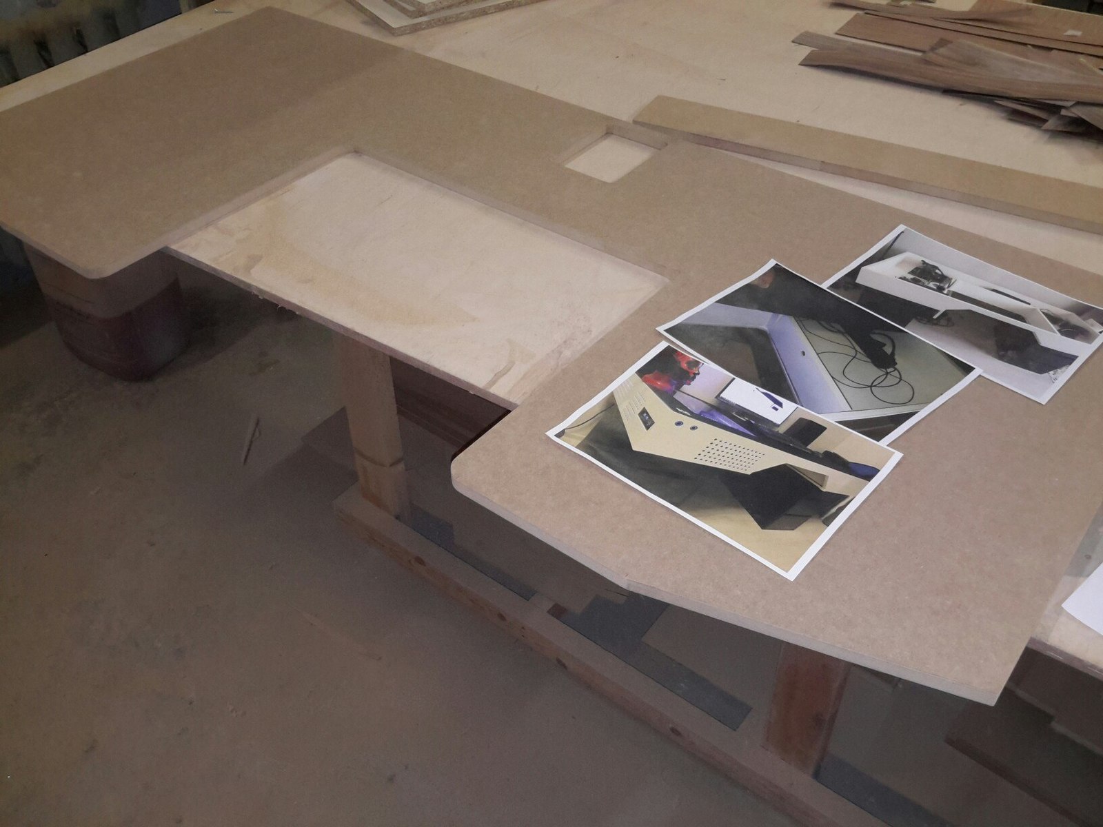 - В передней планке столешницы вырезают необходимое количество технических отверстий для установки кнопок, переключателей, динамиков.