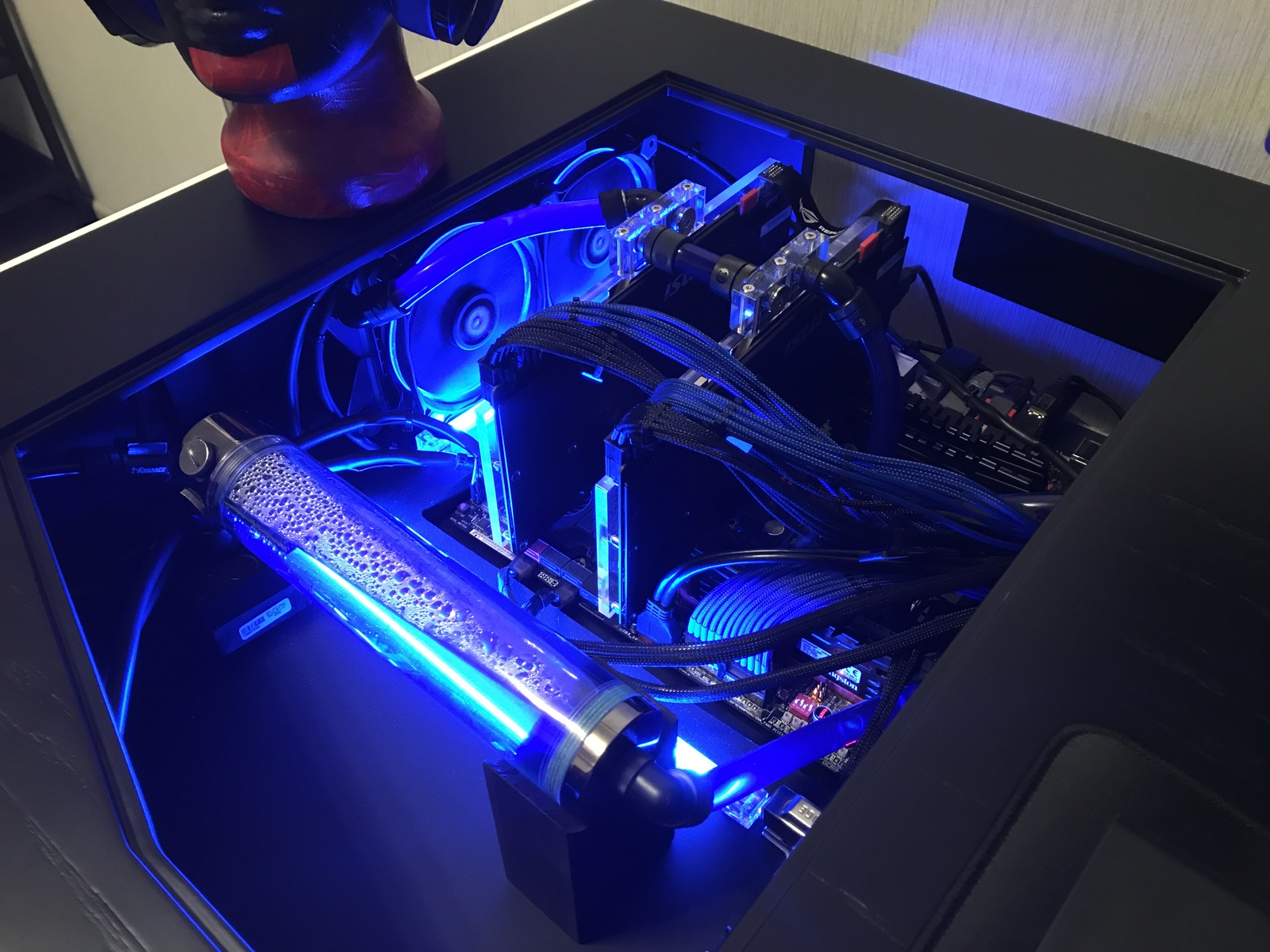 - Вот так выглядит наш ПК, как видите, сложностей нет. На этом этапе можно проявить фантазию, также можете сделать и подсветку, для этого почитайте статью о том, как сделать подсветку в шкафу.