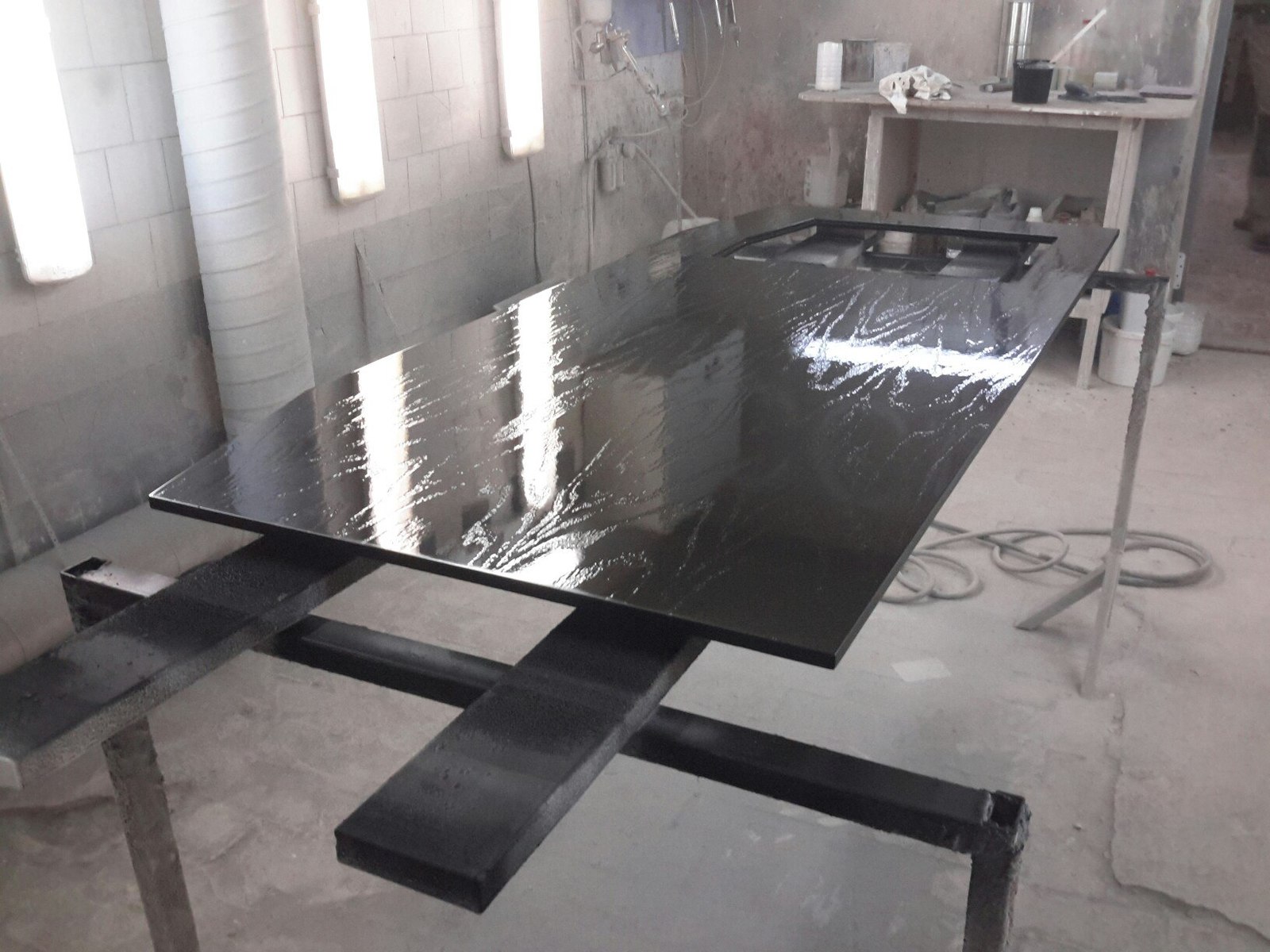 - Из оргстекла вырезают по размерам старой столешницы новую крышку и фиксируют ее с помощью клея на каркас стола.
