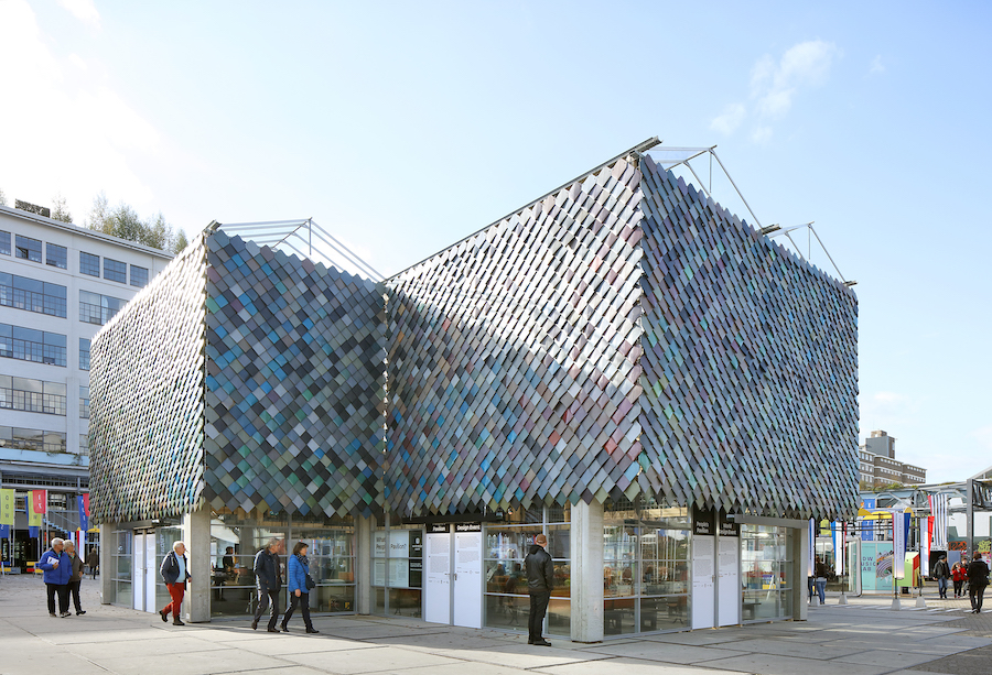 Overtreders W — амстердамское агентство пространственного дизайна, основанное в 2006 году Рейндером Баккером и Хестер ван Дейк. Bureau SLA архитектора Петера ван Ассе существует с 2002 года и также находится в Амстердаме. Главным местом встреч и центральной дискуссионной площадкой на Голландской неделе дизайна в 2017 году стал «Народный павильон» (People’s Pavilion). Получив заказ на проектирование объекта, Overtreders W и Bureau SLA предложили неординарный подход к «зеленому строительству». Все материалы, необходимые для создания павильона площадью 250 кв. м, взяли в аренду на девять дней. Принцип «100% взаймы» предполагал, что детали нельзя ни привинчивать, ни склеивать, ни сверлить, ни пилить: они должны были вернуться к хозяевам неповрежденными. Детали скреплялись между собой ремнями и стальными лентами. Черепицу изготовили из бытовых пластиковых отходов по собственному проекту Bureau SLA и Overtreders W. «Народный павильон» тем самым открывает новые перспективы в «зеленой архитектуре»: выразительный дизайн в нем сочетается с формированием новых социальных партнерств и применением технологий интеллектуального строительства.