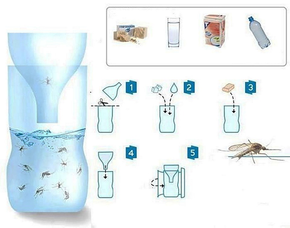 Сначала емкость разрезают поперек пополам. Потом отрезанное горлышко переворачивают вниз и вставляют в нижнюю часть. В емкость наливают сироп из сахара и дрожжей, который привлекает насекомых. Ловушка притягивает своим ароматом пчел, мух, комаров и других насекомых. Они забираются в емкость, но выбраться обратно не могут. Изделие ставят на подоконник или подвешивают в беседке либо частном доме.