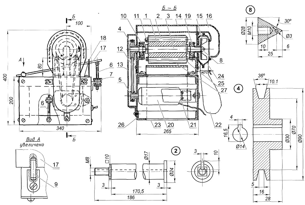 - Натяжной ролик. Вал и подшипники такие же, как у ведомого валика. Наружная поверхность бочкообразная, без бортиков, шириной 60 мм.