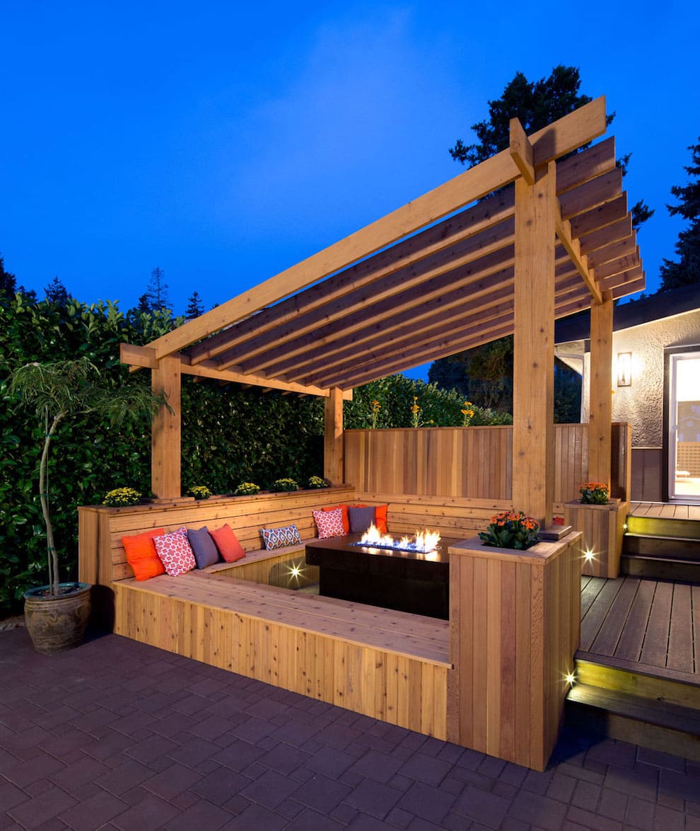 Беседка или навес, это обычное дело для переднего двора. Они окружаются цветниками и вьющимися растениями, и вместе составляют ландшафтную композицию.