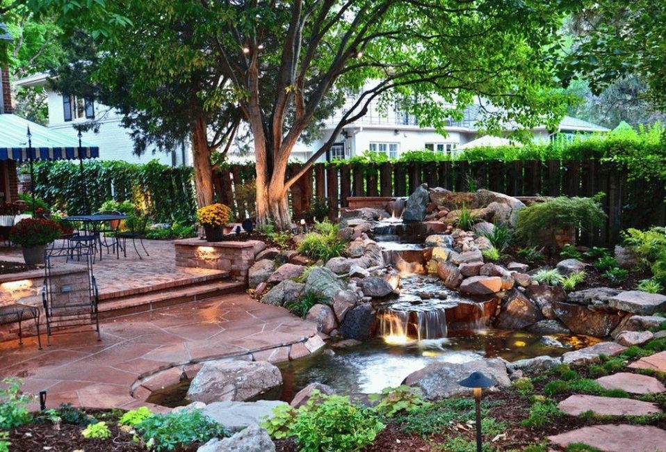 При наличии свободного места дополнить картину можно любым гидротехническим сооружением: водопад, фонтан, искусственный пруд. Близость воды способствует особому микроклимату, особенно желательному возле места отдыха.