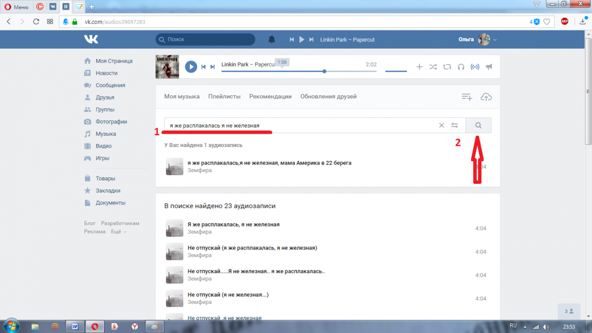 Далее в появившейся строчке поиска вбиваем несколько слов из песни и кликаем на кнопку поиска: