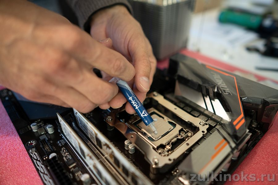 Вот мы и пришли к тому моменту, когда можем нанести на процессор термопроводящую пасту. Возьмите тюбик пасты и капните немного в центр процессора. Каким слоем наносить термопасту? Тонким. Капните небольшую каплю, а не жирный слой, который не будет отводить тепло.
