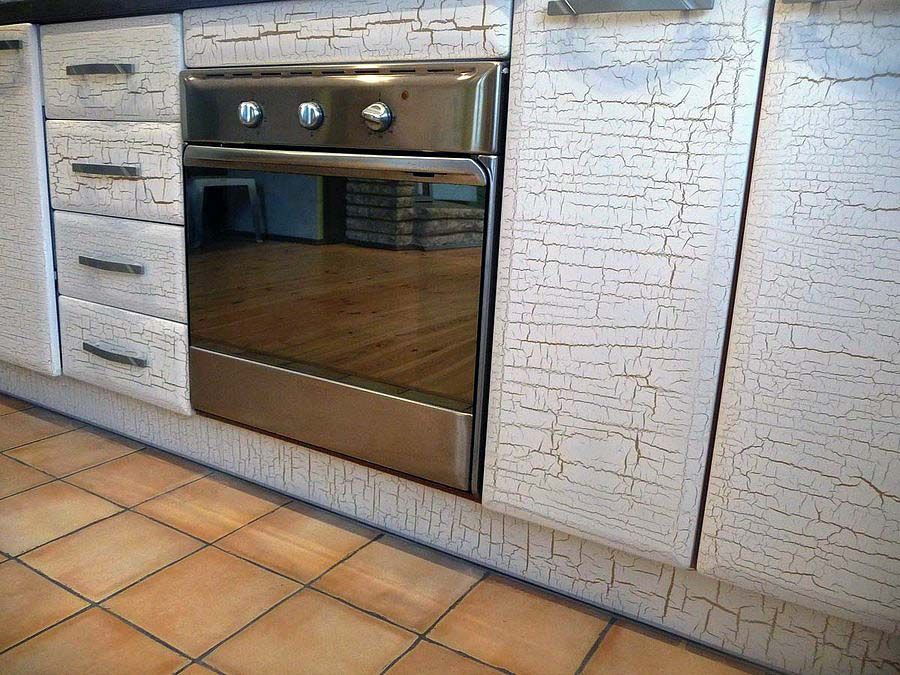 Начинают работу с подготовки основания. Сначала на кухонном шкафу снимают всю фурнитуру, вместе с этим проводится демонтаж дверей. Теперь обследуем поверхность шкафа на наличие дефектов, сколов, выбоин или трещин, других выступающих частей.