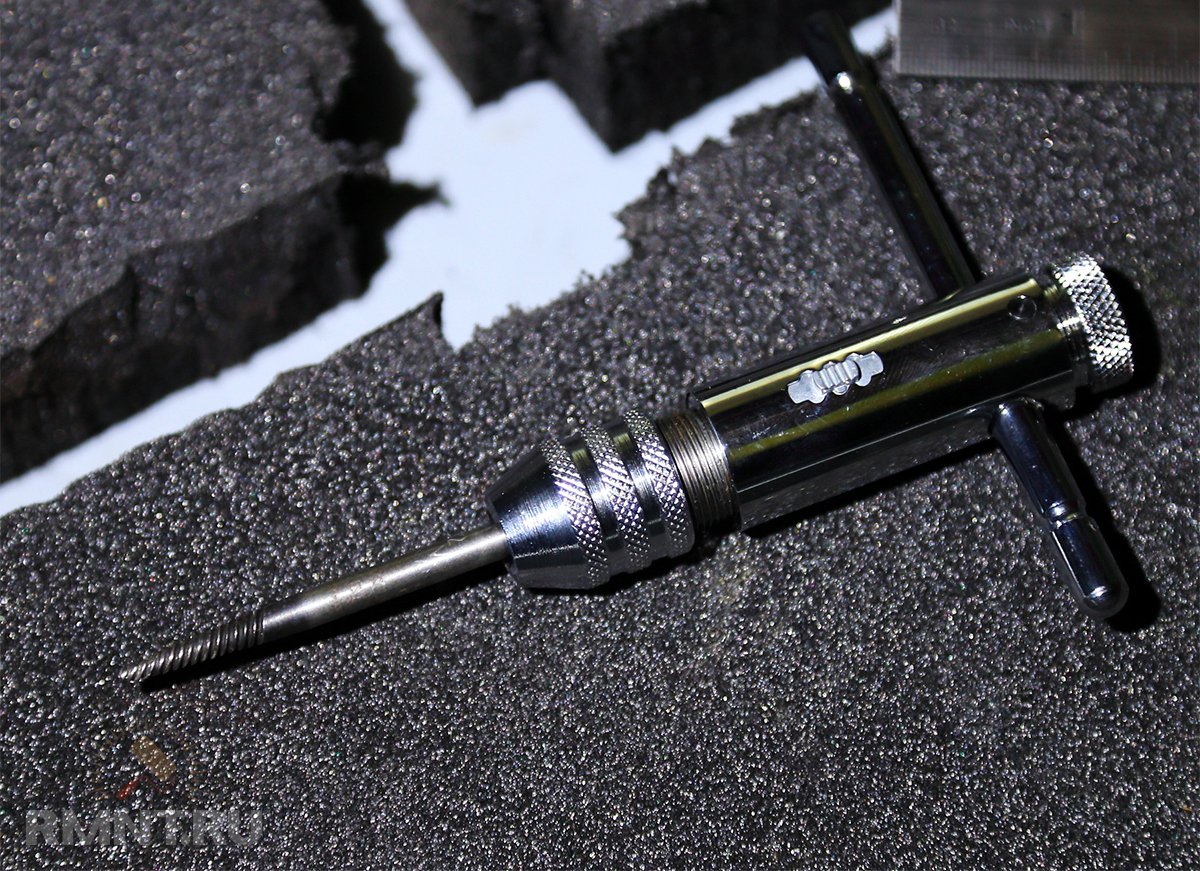 - Если выкрутить обломок всё же не вышло, можно попробовать удалить его таким способом. В болте сверлите отверстие максимально возможного диаметра, стараясь не повредить резьбовое соединение. Затем берёте соответствующий метчик и нарезаете в отверстии резьбу. Во время этого процесса прочищается резьба и удаляются остатки болта.