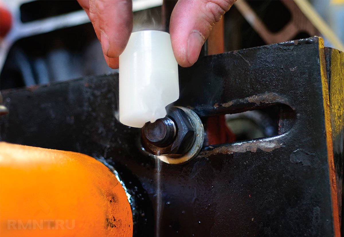 Если болт прикипел на передней стойке, растворяющее вещество можно аккуратно влить в «стакан». Главное — не повредить резинки на стойках, иначе придется их менять.