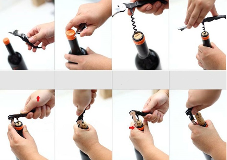 Согласно этикету, открывать вино классическим штопором следует по такому алгоритму:
