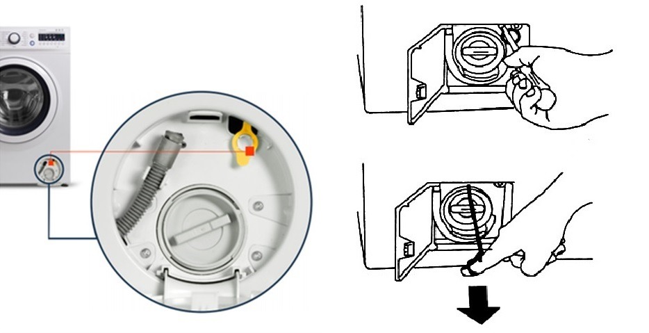 Чтобы самостоятельно справиться с такой поломкой, предстоит удалить воду. Здесь вам поможет либо трос аварийной разблокировки, либо ручной слив воды. Обе детали расположены в нижнем правом углу машинки возле фильтра