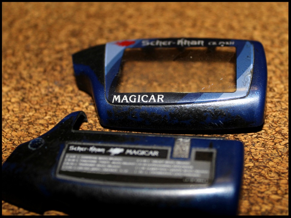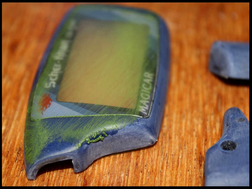 Брелок достался мне вместе с ключами, после 2-х летнего пользования им. И естественно он был весь пошарпан об рулевую колонку и контакт с внешним миром ). Глядя на заюзанный и поцарапанный брелок, пол года назад перекрасил корпус в черный цвет, но со стеклом так и остались проблемы. Само стеклышко было покрыто изначально производителем лаком, который повсеместно облез.Вот в таком виде был до обработки мой брелок от сигнализации.