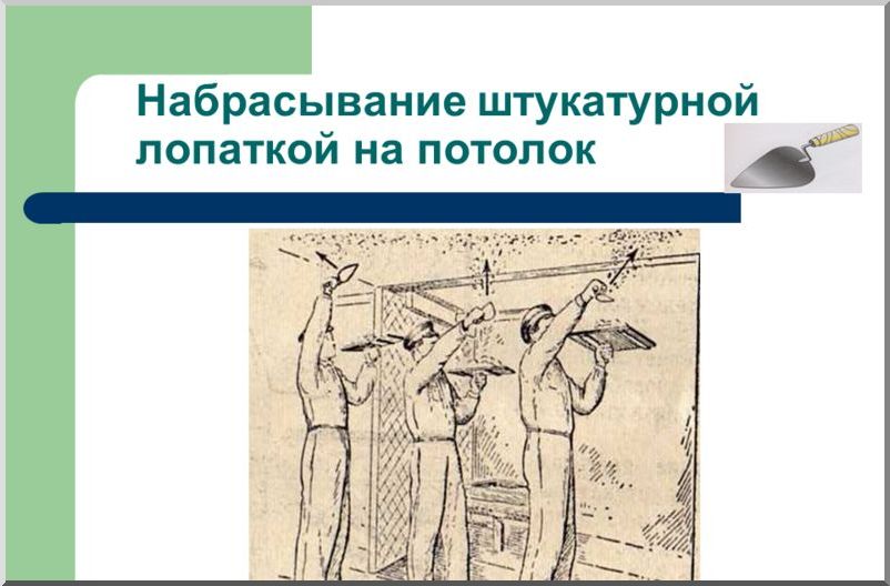 Все последующие слои раствора аккуратно наносятся на плоскость шпателем до тех пор, пока штукатурка не выйдет за пределы маяков, после чего берется правило и с опорой на маяки выравнивается потолок