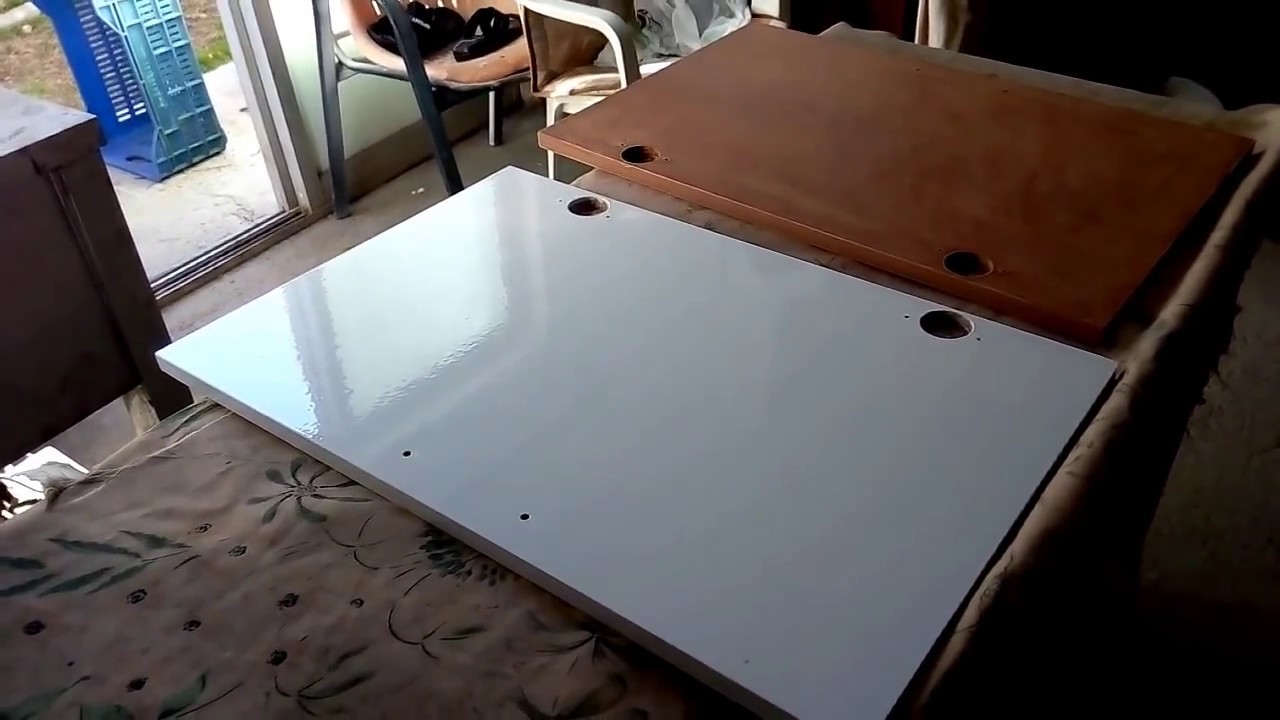 Теоретически, можно реставрировать старый стол в любом состоянии, даже в таком. Здесь первое, что нужно сделать, это снять старые столешницы из МДФ, а затем приклеить широкие панели … толщина в данном случае 16 мм. Затем слегка отшлифуйте основания шлифовальной губкой. Причина, по которой надо покрасить каркас, заключалась в том, что царги – это МДФ, а ноги сделаны из дерева. Возьмите верхнюю часть, обрезанную по ширине и отшлифованную. Закруглите края с помощью фрезера и установите столешницу по старым шурупами. Нанесите 3 слоя глянцевого полиуретана – должно получиться круто.