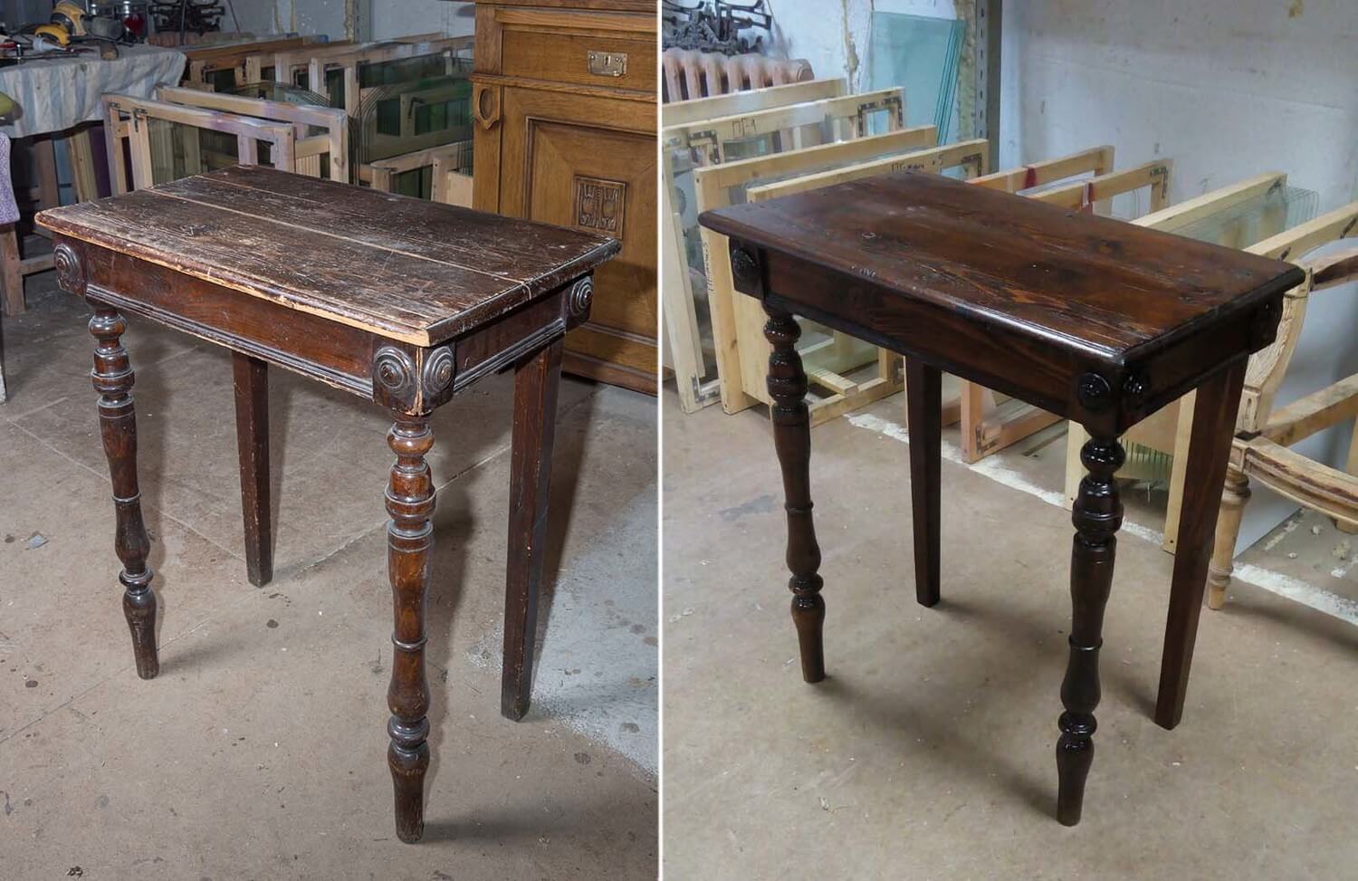 Столы различают по функциональности на письменные, обеденные, кухонные и журнальные. В зависимости от их назначения также различается их строение, а следовательно, и процесс реставрации. Как правило, обеденные столы состоят из 4-х ножек, банта и столешницы. Они могут быть цельными или раскладными
