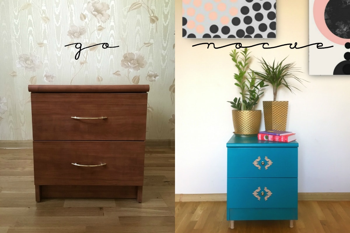 Пример отреставрированной прикроватной тумбочки. Теперь это яркий элемент интерьера и функциональный предмет мебели в спальне