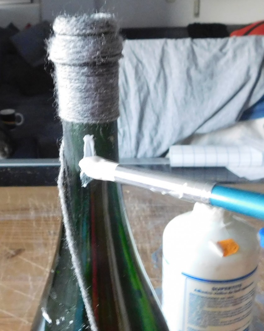 Затем возьмём наш кусок нитки и опустим его в растворитель или керосин (второе средство лучше подходит для этих целей). После того, как нитка хорошенько пропиталась горючкой, немедля обмотаем её вокруг бутыля, в предполагаемом месте реза. Если нитка плохо держится, то её можно завязать на узелок, ничего плохого не будет.