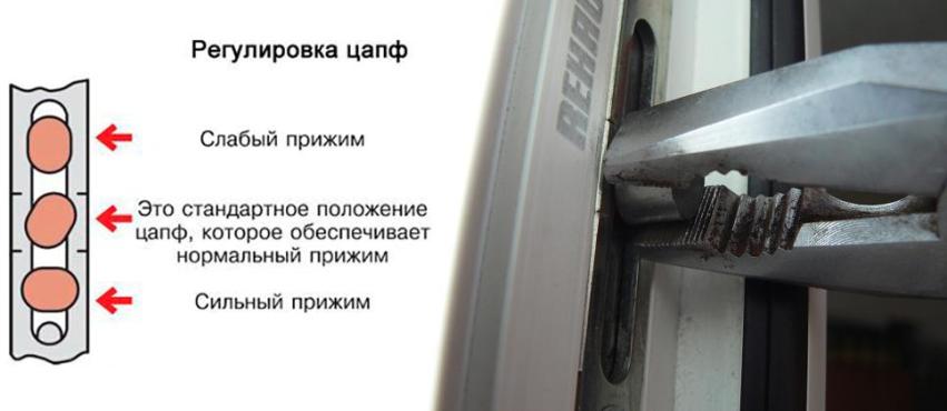 Изменяя положение цапф (смотрите фото), меняете степень прижима, то есть устраняете сквозняк из-под створки.