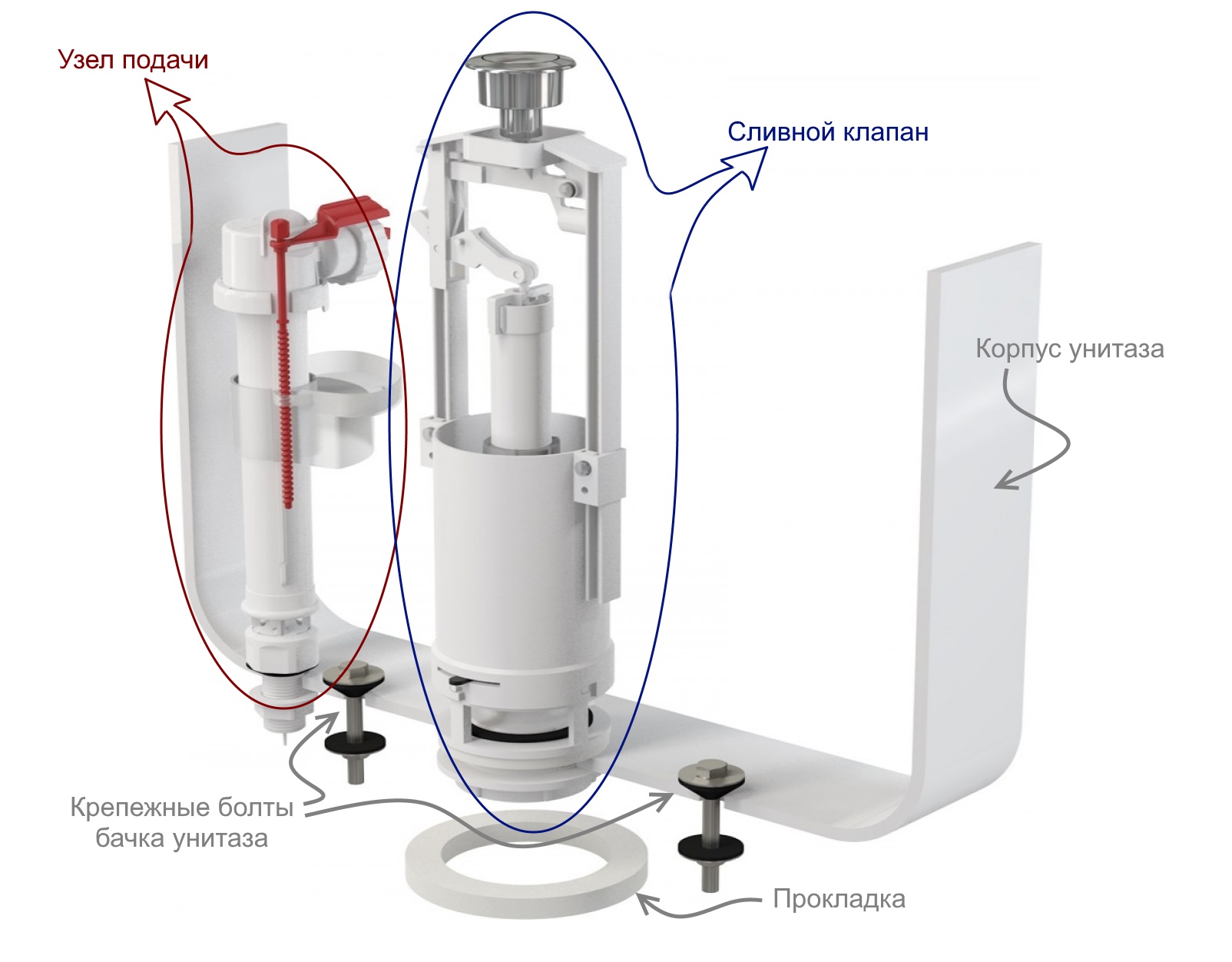 В комплект входит: клапан наполнительный, клапан выпуска, кнопочный узел, комплект крепления бачка и прокладки. В зависимости от типа наполнителя бачка, клапан наполнителя может быть с боковой подводкой и с нижней подводкой. Клапан выпуска может быть одноуровневый или двухуровневый.