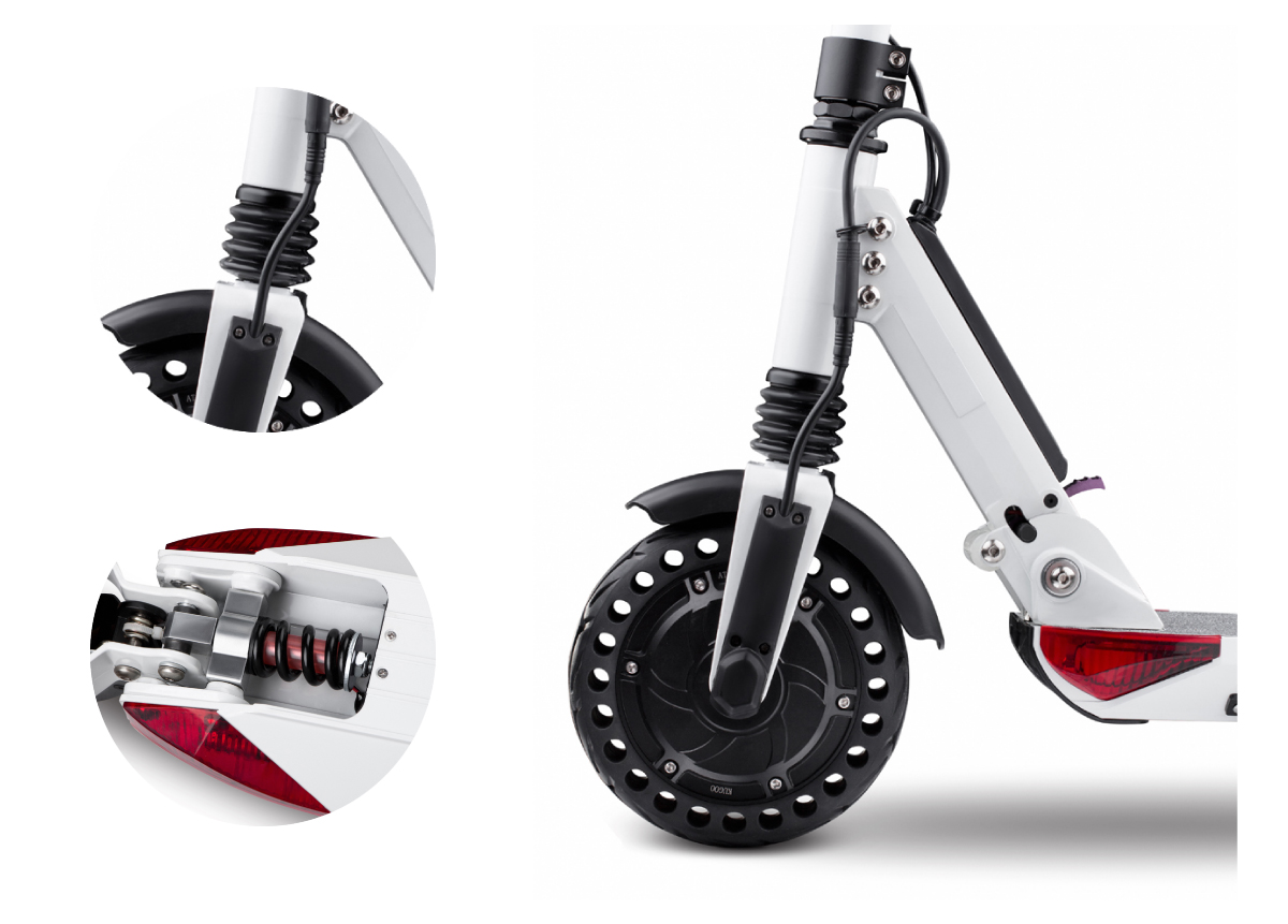 Для того чтобы складывать самокат было легче, имеется специальный крюк. Высоту руля можно регулировать. Амортизаторы расположены спереди и сзади. Самокат имеет небольшие размеры и легкий вес.