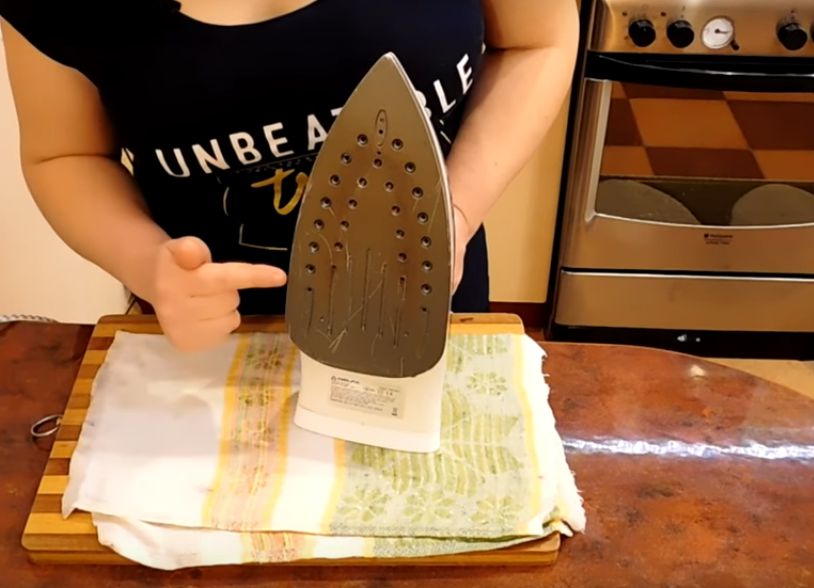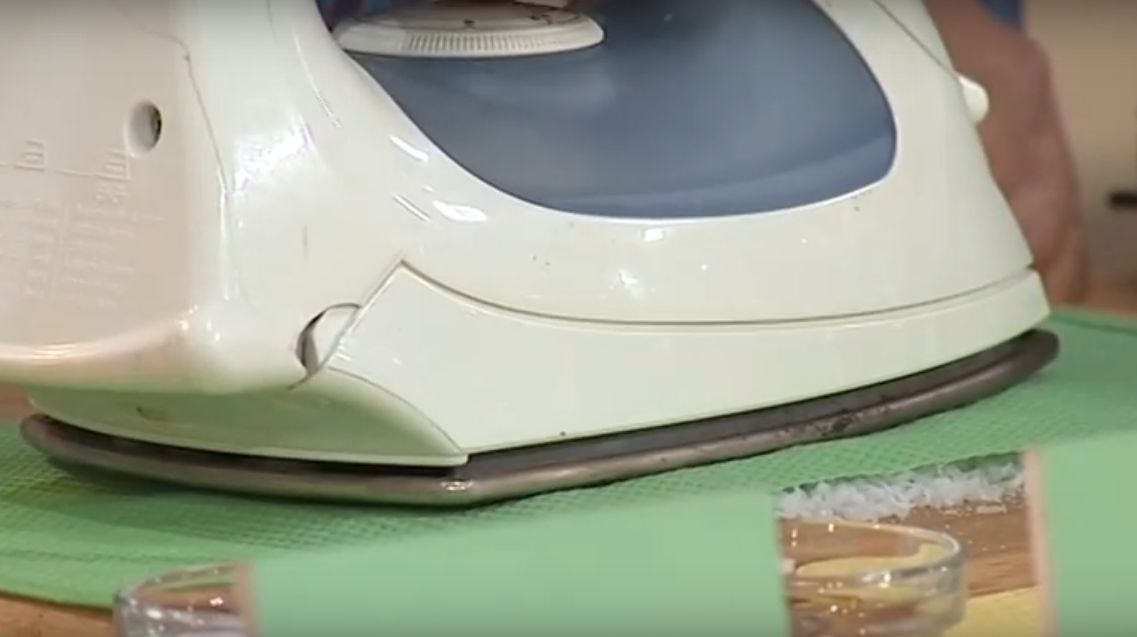 Подставьте под приспособление для утюжки поддон, чтобы парафин не потёк на пол или на стол. Вертикально утюг нужно держать, чтобы плавящееся средство не затекло в дырочки для пара. Когда грязь уйдёт, потрите поверхность утюга о хлопковую ткань, чтобы удалить следы парафина.