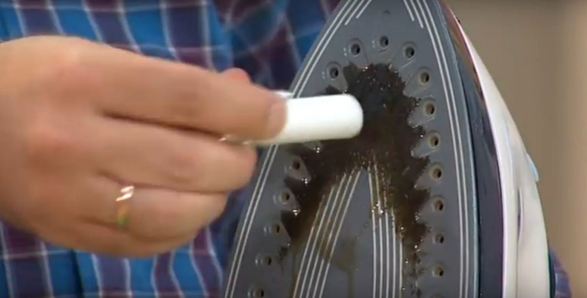 Также можно использовать химический карандаш. Чтобы снять налёт, разогрейте прибор, прижмите брусок к подошве и аккуратно протрите загрязнённые места. Когда состав разъест нагар, потрите поверхность о гладкий хлопчатобумажный лоскут. Процедура эффективная, но не слишком приятная – карандашик издаёт резкий нашатырный запах.