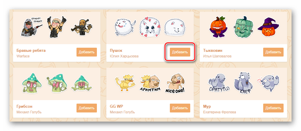 Выберите себе набор наклеек в нажмите кнопку «Добавить».