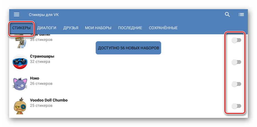 Далее, находясь на вкладке «СТИКЕРЫ», включите интересующие вас наборы наклеек с помощью переключателей в правой части экрана.