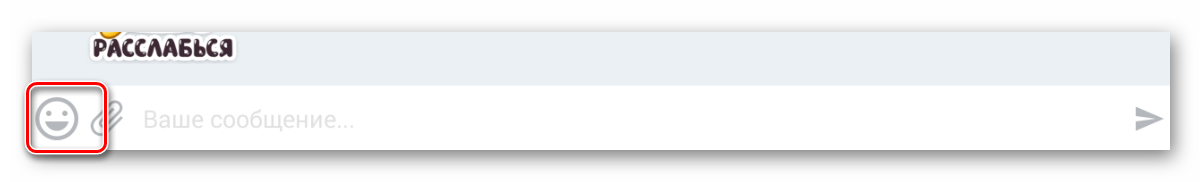 В открывшемся окне нажимаем на значок смайлика, который располагается рядом с полем для ввода сообщения.