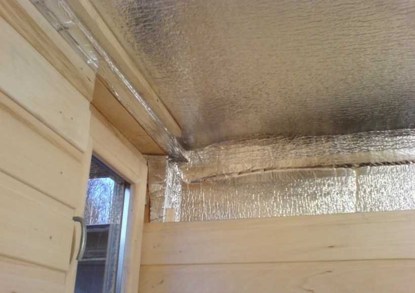Обязательным является выполнение пароизоляции утеплительного материала по внутреннему основанию. В парилке нужно использовать фольгированную пароизоляцию. Отражающий слой способен повысить температуру внутри парной.