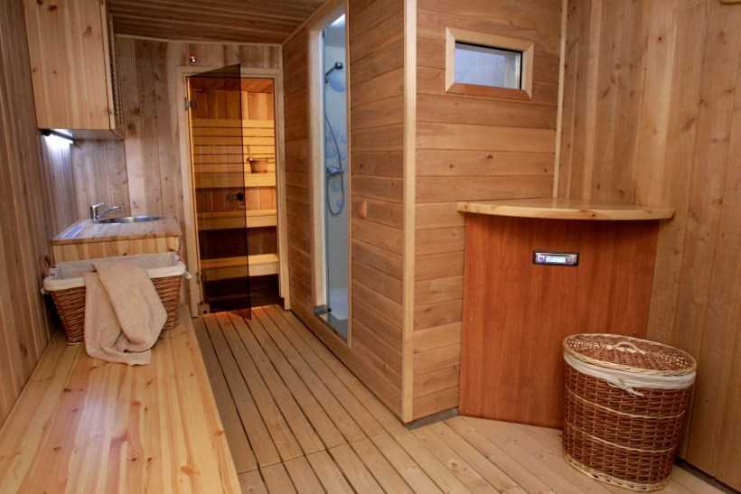 В предбаннике устанавливают стол, стулья и вешалку, в парной и душевой – полки и скамейки.