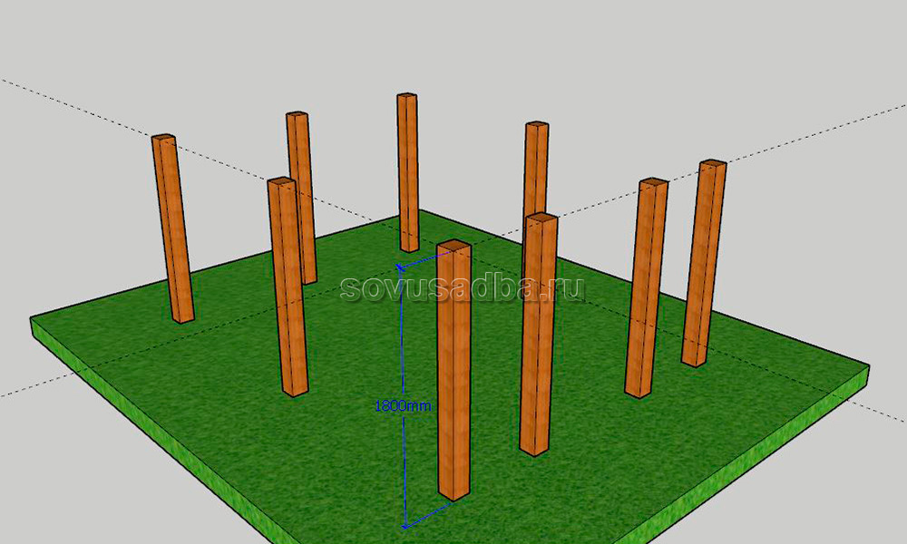 Теперь стойки. У нас это будет 9 брусьев сечением 150×150 мм и длинно в три с половиной метра. Если таковых не нашлось можно взять ошкуренное бревно и подогнать его под диаметр скважин. Брус красивее, бревно дешевле и долговечнее