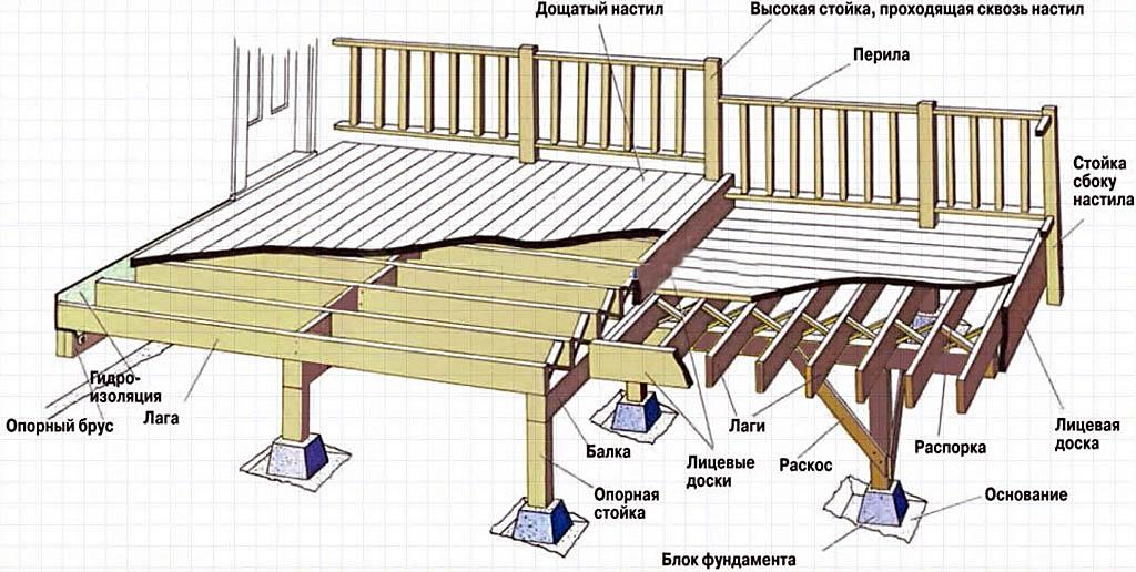 - обеспечить хорошую вентиляцию настила, особенно если он будет выполнен из натуральной древесины. В противном случае обеспечено гниение досок снизу и нарушение прочности конструкции;