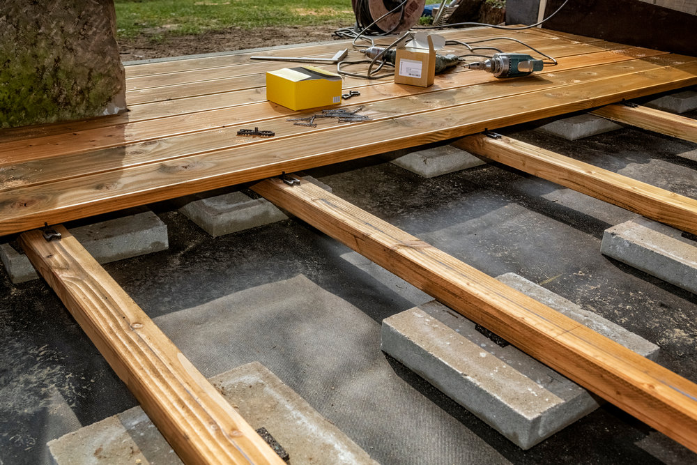 - при выборе опоры настила по всей поверхности убрать грунт с размеченного пространства на глубину минимум 15…20 см и заменить отсыпкой из смеси песка и щебня (либо щебня и песка слоями). При этом также сохраняется необходимость в устройстве вентиляции настила.