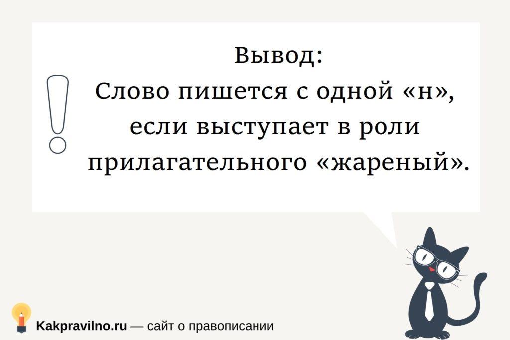 Выбрать правильное написание следует после установления части речи. Если слово «жареный» – прилагательное, то наблюдаются следующие особенности: