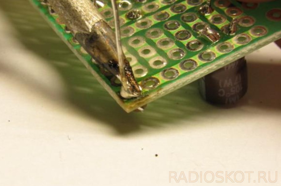 Некоторые радиолюбители используют для этого остро отточенную спичку (зубочистку), посредством которой посадочное отверстие прокалывается с одновременным прогревом остриём жала паяльника.