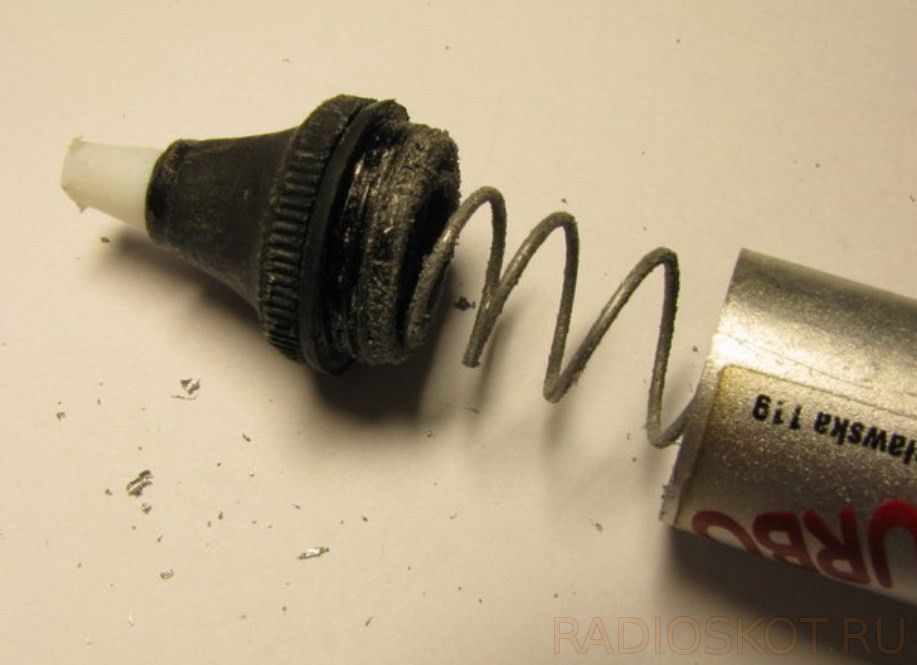 С оловоотсосом дела обстоят аналогичным образом – взводится пружина, разогревается контакт, после чего наконечник подносят к расплавленному припою и нажимают кнопку. Создается разрежение, которое и втягивает припой внутрь оловоотсоса.