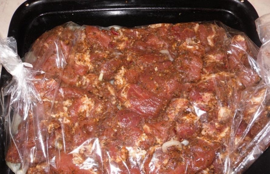 Либо предварительно насадить мясо на шампуры или вымоченные в воде деревянные шпажки и разместить в жаропрочном полиэтилене. Закупорить вторую сторону аналогичной скрепляющей деталью.