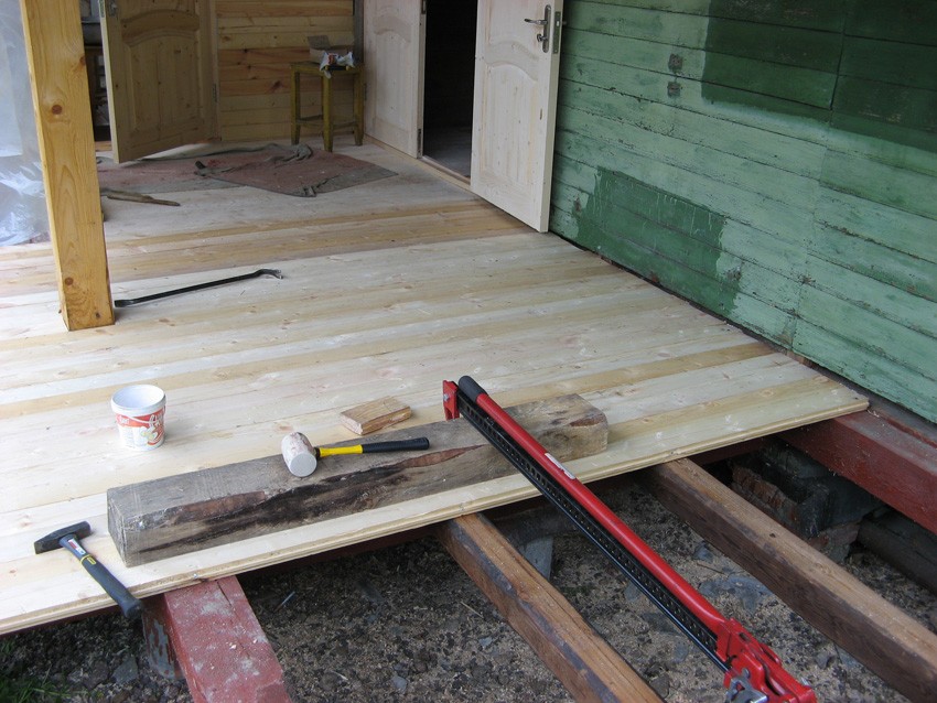 - Устраивается основание и настил пола. Наиболее популярным является настил террасной доски, декинга или шпунтованной доски по деревянным лагам.