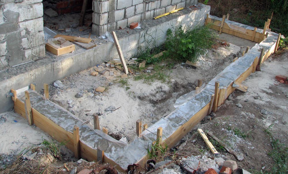 - Выполняется фундамент. Для столбчатых опор выполняются столбики из кирпича, блоков или монолитного бетона, ленточные основания заливаются в опалубку или монтируются из блоков. Верхняя часть ленточных или столбчатых опор обязательно защищается горизонтальной гидроизоляцией, подземная часть – обрабатывается рулонной или обмазочной гидроизоляцией. Ленточный фундамент или столбы «связываются» с фундаментом основного здания закладными на стадии армирования.