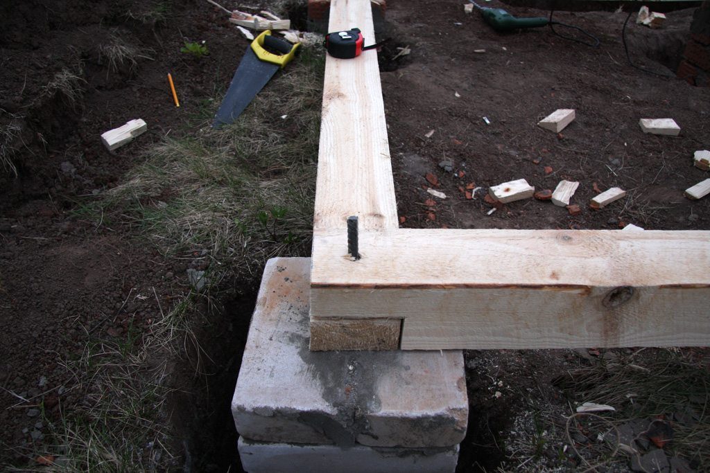 Во избежание возможного смещения каркаса террасы относительно основания (об этом стоит подумать на этапе возведения фундамента) в верхней части столбов или ленты оставляют несколько обрезков стальной арматуры диаметром 8 или 10 мм и длиной свободного конца 200-250 мм. Перед укладкой обвязки в точках выхода стальных стержней сверлятся отверстия большего диаметра, и брус укладывается на штыри, которые затем загибаются заподлицо.