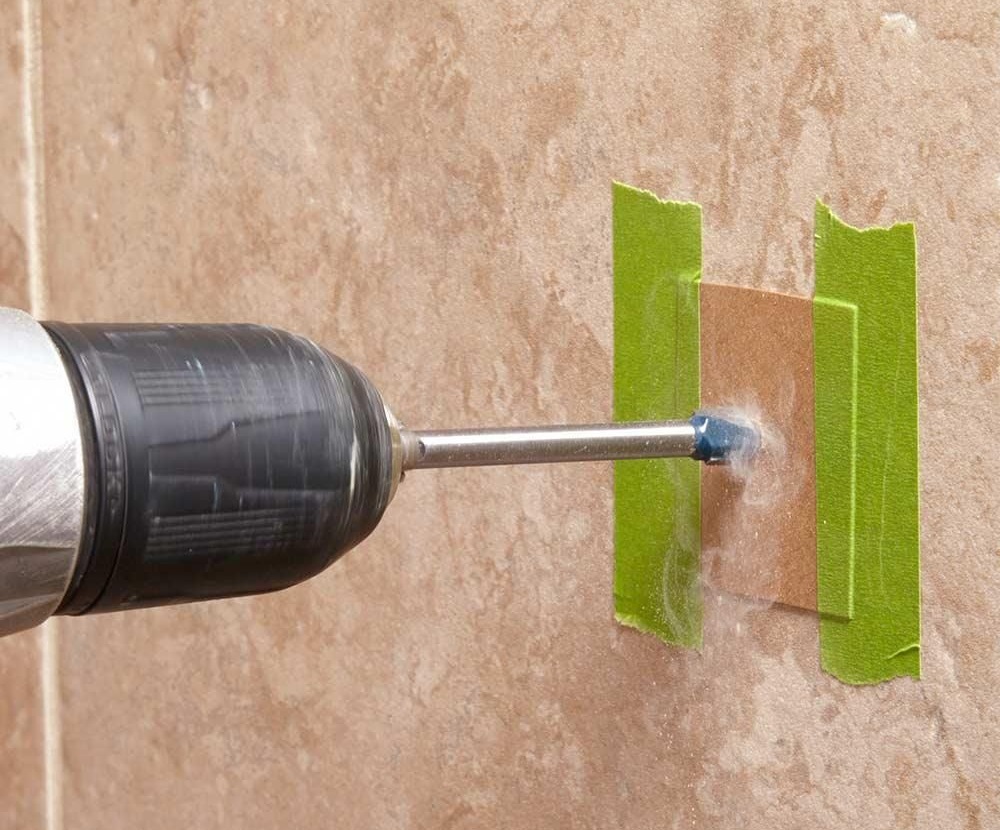 Совет от специалистов: для того, чтобы сверло не скользило по кафелю, можно наклеить кусочек изоленты или скотча.