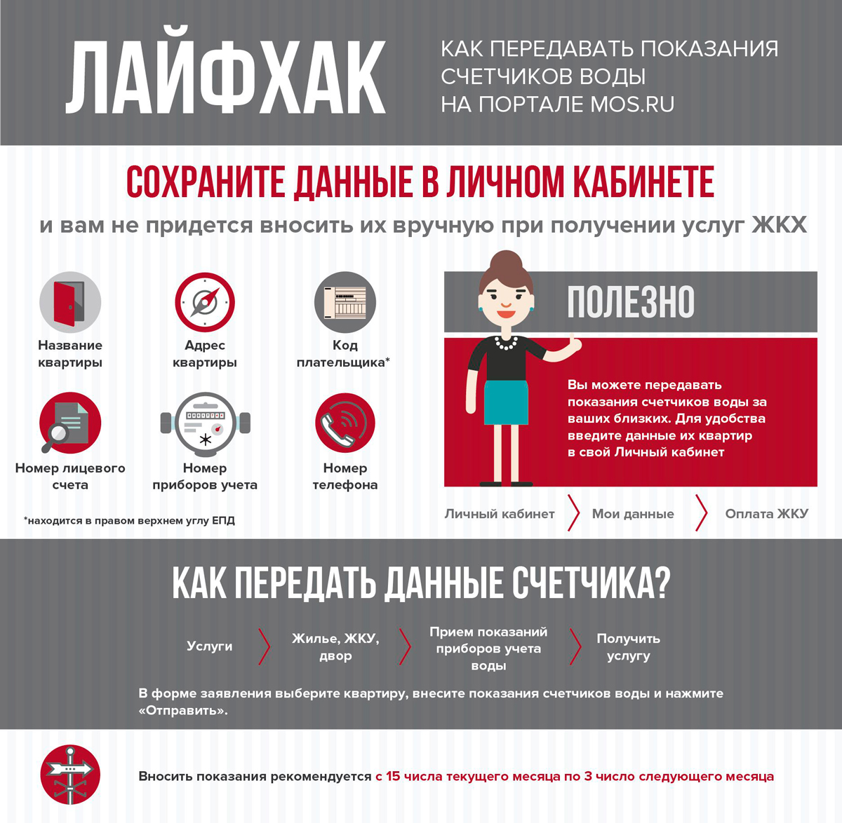 Если все жители квартир будут подавать сведения в одно и то же время, то разница между индивидуальным расходом воды в квартире и общедомовым расходом уменьшится. Именно поэтому многие управляющие компании на специальных контейнерах указывают точные сроки подачи листка с записями и номером квартиры. Кроме того, на самих платежках нередко имеется запись с просьбой подать сведения не позднее определенного числа.