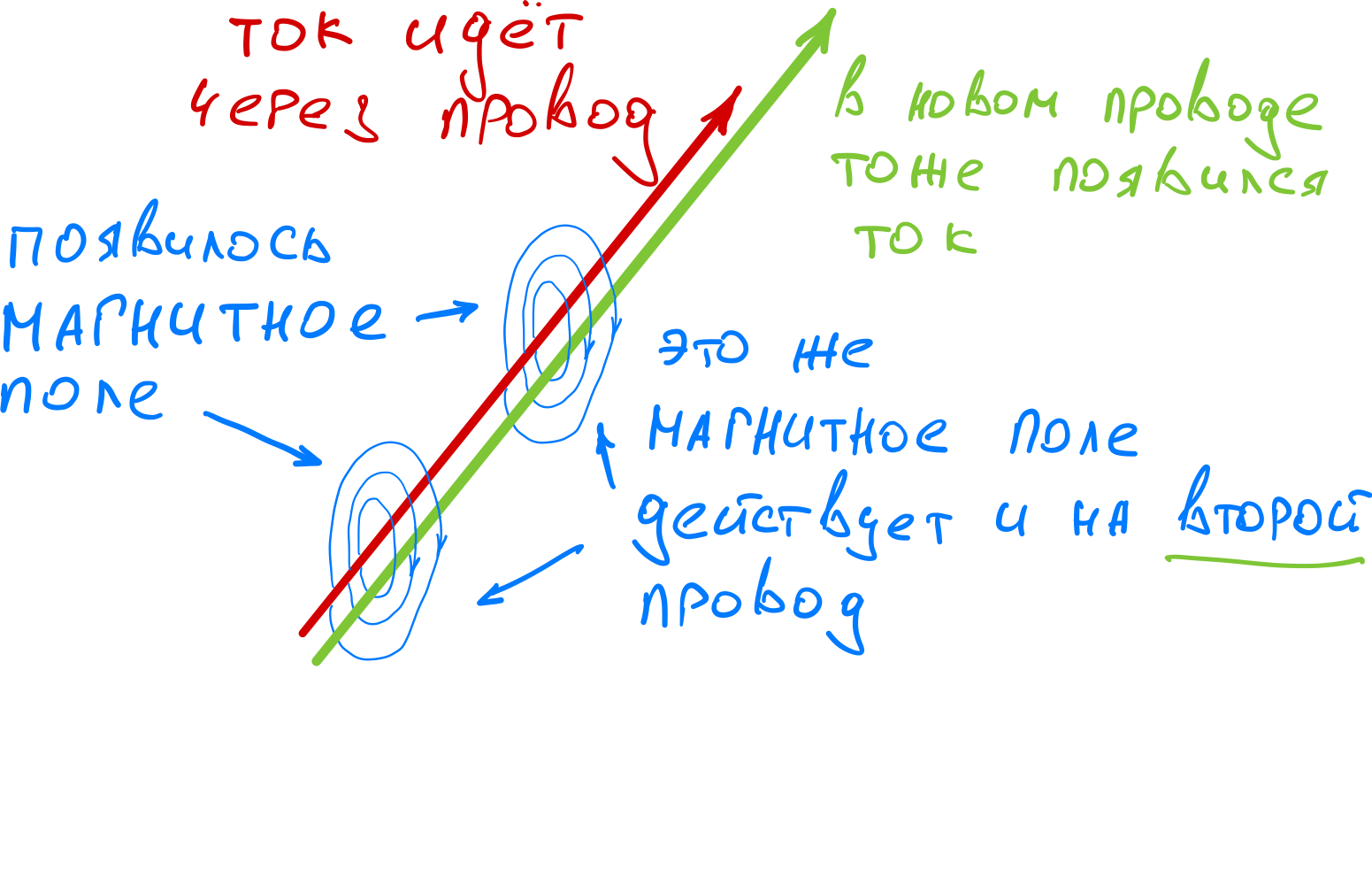 Но у магнитного поля есть и обратное свойство: если его точно так же пустить вдоль другого провода, то в этом проводе появится ток: