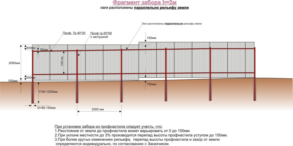 Чертежи заборов составляются на начальном этапе, что значительно упрощает монтаж и позволяет построить надежную конструкцию. Расположение профлиста относительно грунта может быть разным: утопленная или приподнятая установка. Если выбран ленточный вариант фундамента, в данном случае также зазор между основанием и профнастилом разнится.