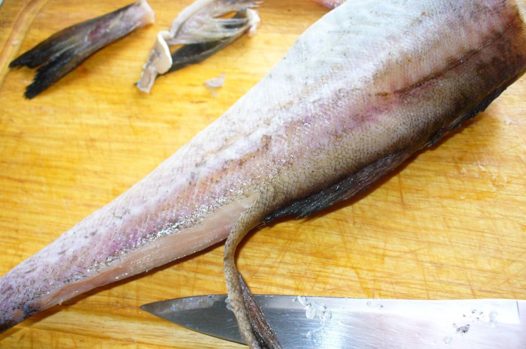 Обычно тушки минтая продаются без головы и внутренностей. Поэтому разделка и чистка рыбы упрощается. Для домашней готовки мы используем только филе минтая, удаляя кожу и, по возможности, все косточки. Костей в минтае немного. Достаточно срезать реберные кости и позвоночник.