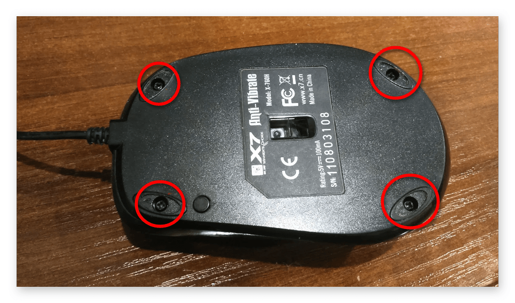Когда винт не удается обнаружить под наклейкой, но корпус все равно не получается разобрать, следует икать крепеж под накладками — так называемыми ножками мышки, которые создают трение с поверхностью для более точной фиксации. Эти элементы держатся на клее, поэтому после снятия их получится вернуть обратно на место.